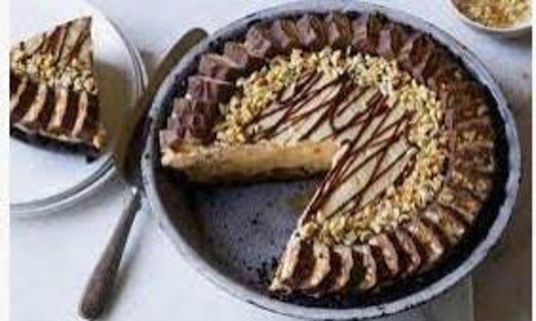 Snickers Pie- Creamy Peanut butter nugget filling, in a Oreo cookie crust, topped with Snickers, chocolate and caramel drizzle. Rich and Decadent.